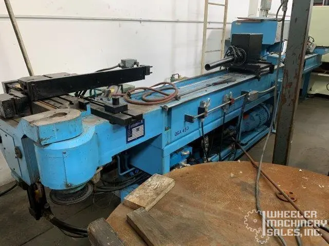 For sale: Used Clarke & Lewis CL200CNC Hydraulic Tube Bender. Handles 2" tubing, 1" Schedule 80 pipes, and 1 1/8" mild steel bars. Featuring a max bend angle of 195° and a PC CNC control. Ideal for precise metal bending needs. Weighs 4,000 lbs.