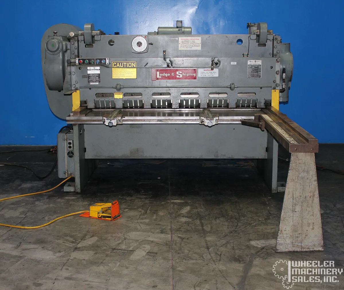 Lodge & Shipley 0306-AB Power Shear available, used condition. Specs: 3/16" cutting capacity, 6' max length, hydraulic hold downs, 60 SPM, 5 HP. Features: power back gauge, air clutch, brake, auto lube, electric foot pedal. 13,500 lbs.