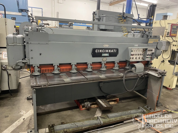 Cincinnati 1008 Mechanical Power Squaring Shear, ideal for cutting 10 Ga. mild steel up to 8'. Features include a rear-operated power back gauge, electric foot pedal, and auto lube system. Efficient with 65 strokes/min and powered by a 5 HP motor.
