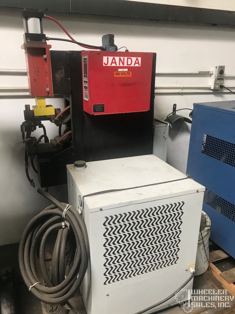 Janda P50-18 used spot welder, 50 KVA, 12" throat depth, 8" gap. Equipped with 600V digital weld control, pneumatic clamping, MTA water chiller. Input voltage: 480V, refrigerant R134A, charge: 0.710 KG. Ideal for precision welding tasks.
