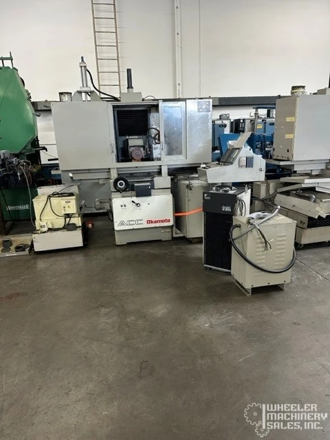 OKAMOTO ACC-820DXNCP 1998 CNC Surface Grinder. Features 8"x20" table, 26" table travel, Fanuc O-M CNC control, 2 HP spindle motor, and Walker magnetic chuck. Includes auto lube, oil cooler, and coolant system. Ideal for precision grinding tasks.