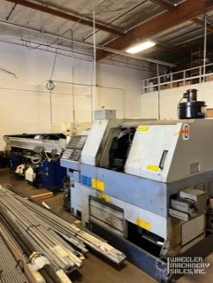 Star SV-20 CNC Swiss Automatic Lathe available, featuring a spindle hole diameter of 20 mm, 5.5 kW power, and up to 10,000 RPM. It includes a Fanuc 16T CNC Control, 9 axes, bar feed, and a coolant tank. Dimensions: 104" x 55" x 66", 7500 lbs.