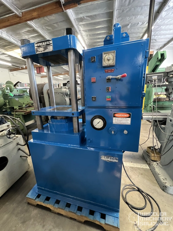 Used Clifton 1P 4-Post Platen Press with a 100-ton capacity. Features a 10" stroke, 23" daylight opening, and 12"x12" platen size. Equipped with auto/manual modes, operating at 125 PSI with a 3 HP motor. Ideal for heavy-duty applications.