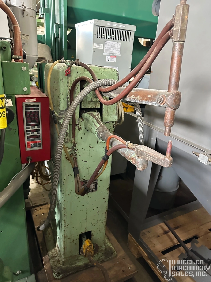Used Acme 0-24-10 Rocker Arm Spot Welder, 10 kVA, featuring a 24" throat depth and 5" throat gap. Equipped with a foot pedal, timer, and water-cooled tips. Weighs 2,250 lbs. Perfect for precision welding needs.