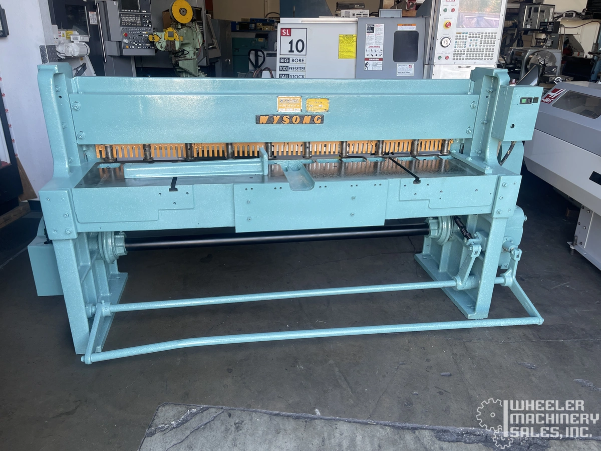 Wysong 1472 6' x 14 ga. Mechanical Power Squaring Shear available. Handles up to 14-gauge mild steel, 16-gauge stainless. Features 24" rear-operated back gauge, 12 hold downs, and a support arm. 230V/3PH, 4,700 lbs, ready for your shop needs.