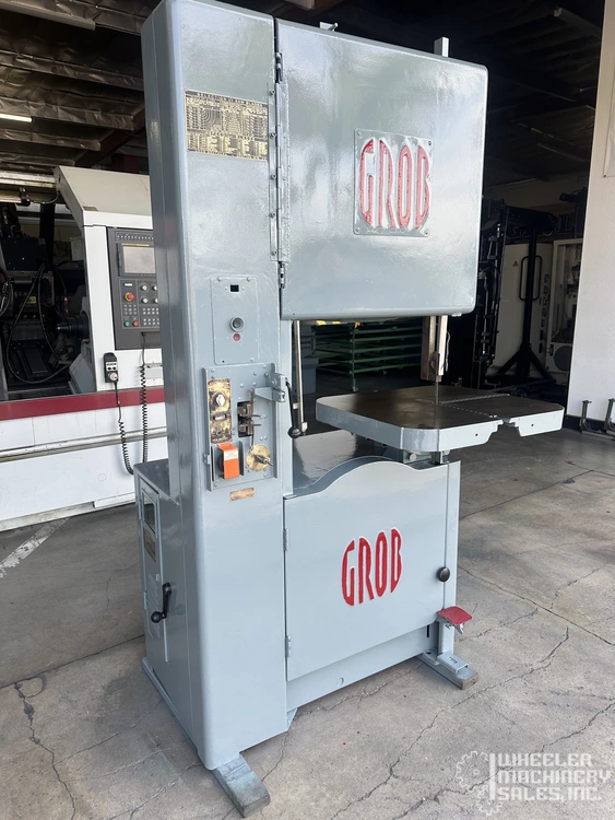 Grob NS 24 Vertical Band Saw, Model #7309 features a 24" depth of throat, 12" max under guide, and 10 blade speeds ranging 50-2030 FPM. 28"x24" table tilts in multiple angles. Comes equipped with blade welder and grinder. 1 HP, 220V, 3-phase motor.