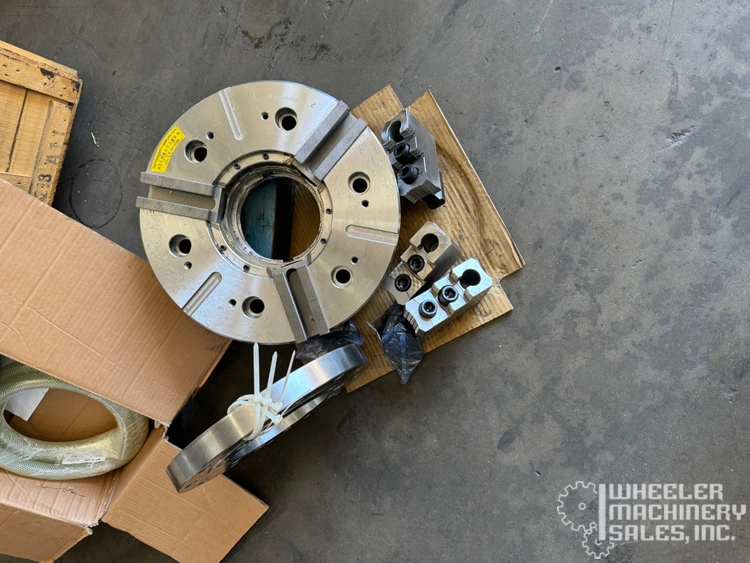 18" Auto Strong NB-218 3-Jaw Chuck with air actuation system, includes powered air actuator, spindle tube, and adapter plates. All components are from Trak Machine Tools 30" lathe.