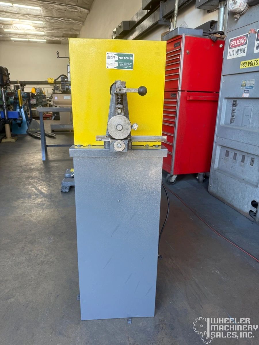 RUOFF V-NOTCH used notching machine offers up to 16 ga. mild steel capacity, 240 punches per minute, adjustable notch centers up to 1-1/8", depth up to 7/8". Powered by a 3/4 HP motor, this reliable machine is compact at 120 lbs and measures 18"W x 12"D x 50"H.
