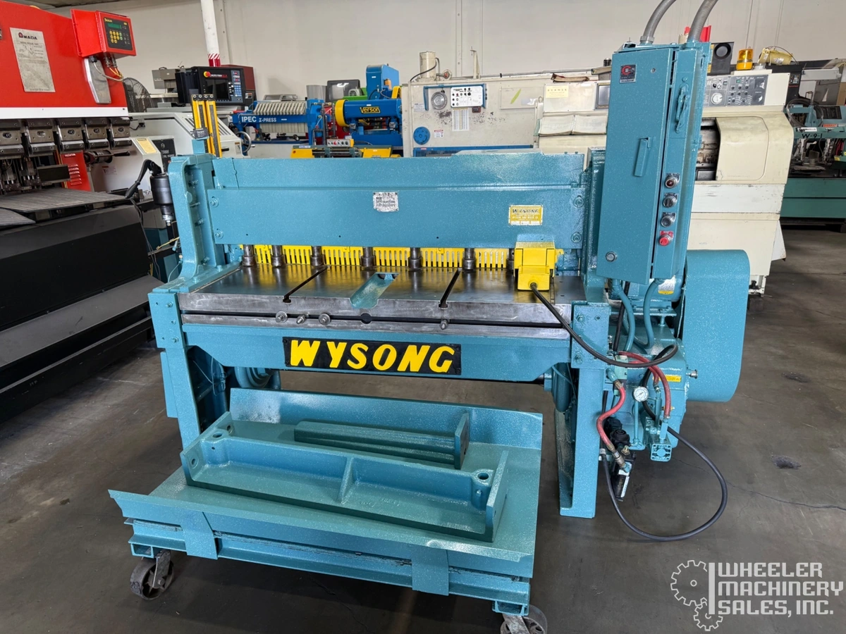 WYSONG 1252 power shear, 12 Ga. x 4', used. Capacity: 12 Ga., Cutting Length: 52", Speed: 60 SPM, Motor: 5 HP. Features manual back gauge, one-shot lube system, and foot treadle. Dimensions: 95"x64"x64", Weight: 4,500 lbs.