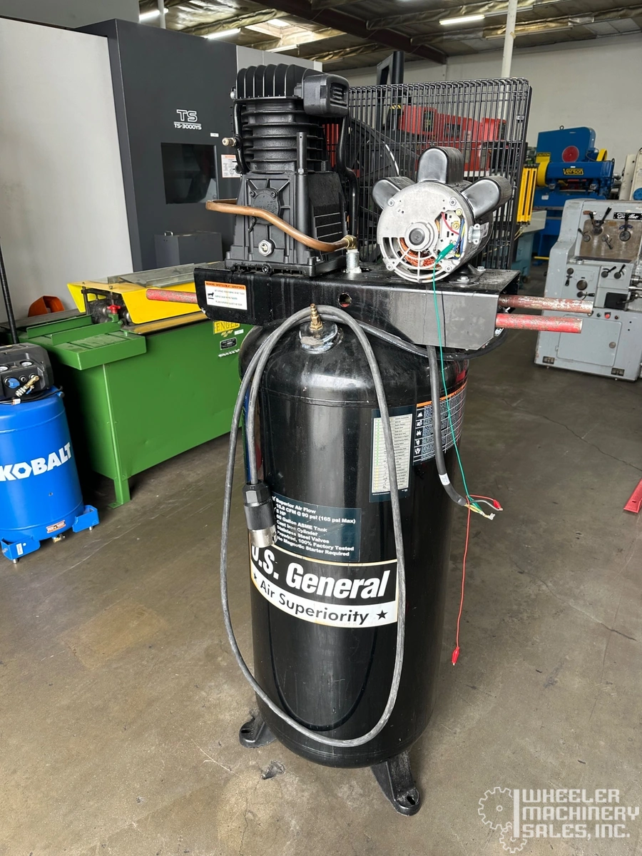 US General 5HP Vertical Compressor, 60-gallon tank, delivers 15.8 CFM. Ideal for reliable air supply needs. Well-maintained used condition, perfect for various applications. Model #7696 #1.