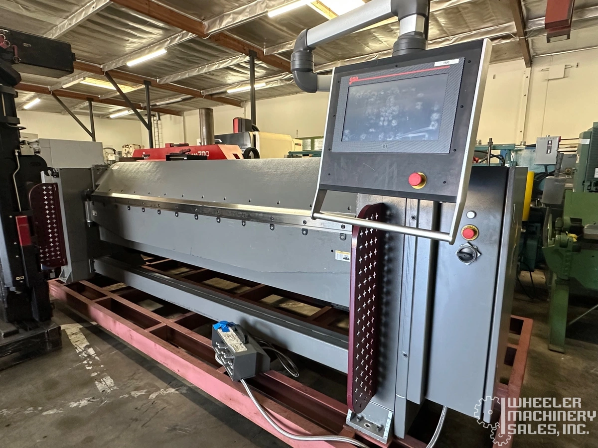 GMC 2023 EFM-1014CNC folding machine, 10' length, 14 ga. capacity. ESA CNC control with a 16” touch screen, supports 99 bends per program. Features include programmable radius bend, 48" back gauge, Yaskawa servo, and Schneider electronics.