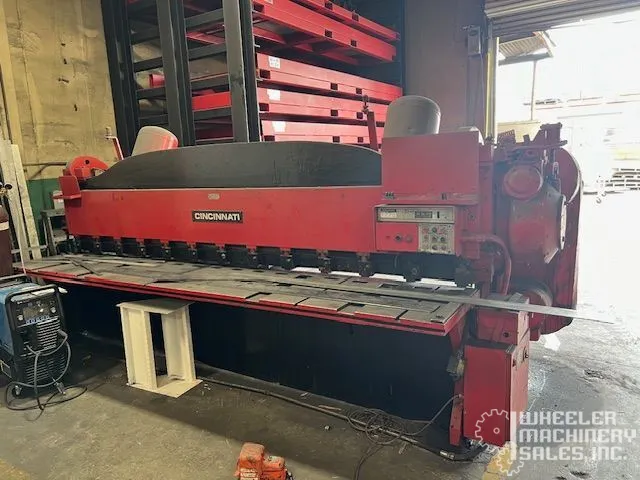 Used CINCINNATI 2CC12 Mechanical Power Squaring Shear. Features include 1/4" cutting capacity, 144-3/4" between housings, and 60 strokes per minute. Equipped with power back gauge, electric foot switch, and more. Ideal for precise shearing tasks.