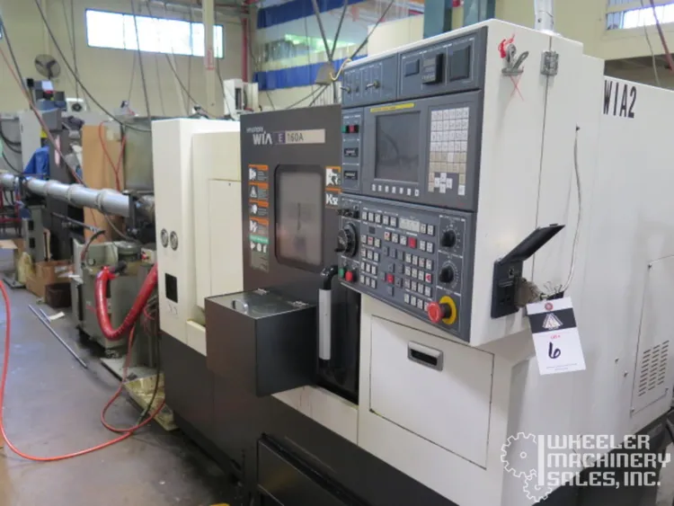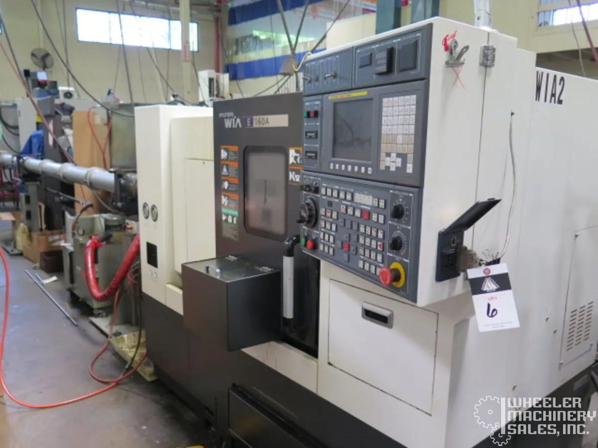2015 Hyundai WIA E160A CNC Lathe, used condition. Max Turning Diameter: 11″, Max Length: 11.8″. Features 6″ chuck, 6,000 RPM spindle, 12-position turret. Includes Fanuc i Series Control, LNS Eco Load S2 Bar Feeder, tailstock, chip conveyor.