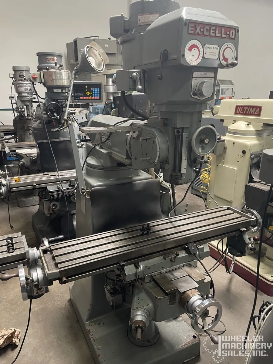 Excello 602 Vertical Mill - 9" x 42" table, 30" longitudinal travel, 16" cross saddle travel, 16" knee travel. Variable spindle speeds (85-4000 RPM), R-8 spindle nose. Features: Variable speed head.