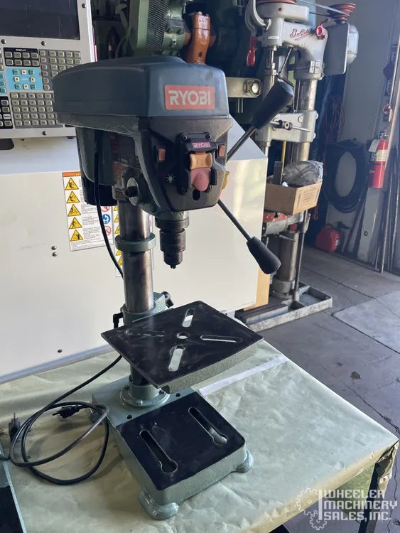 RYOBI DP102L drill press available, featuring a 1/4 HP induction motor and 5-speed settings for various applications. Includes a 1/2-inch chuck and adjustable table for versatile use. Ideal for heavy-duty and sensitive vertical drilling needs. Used condition.