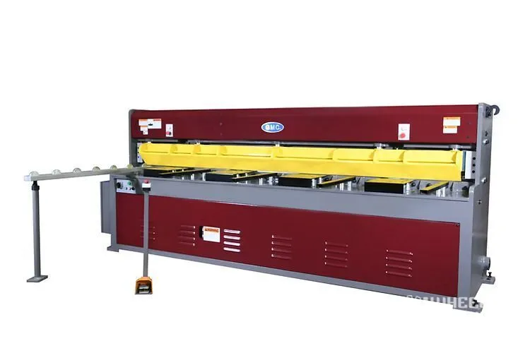 GMC HS-1010M Hydraulic Metal Shear for sale. Suitable for cutting mild and stainless steel, max blade length 10', 10 Ga. capacity. Features include manual back gauge, quick blade gap adjustment, hydraulic hold-downs, and shadow line cutting. Used condition.
