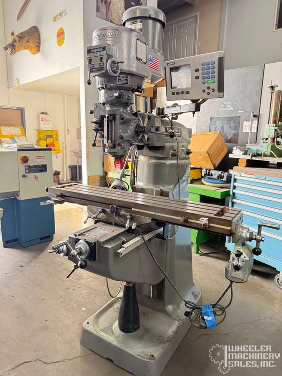 Bridgeport Series 1 vertical milling machine, used, offers a 9"x48" table, 36" X-axis, 16" Z-axis, 60-4200 RPM spindle, R8 spindle taper, and comes with 2-axis DRO, power feed, and more. A reliable choice for precision tasks.