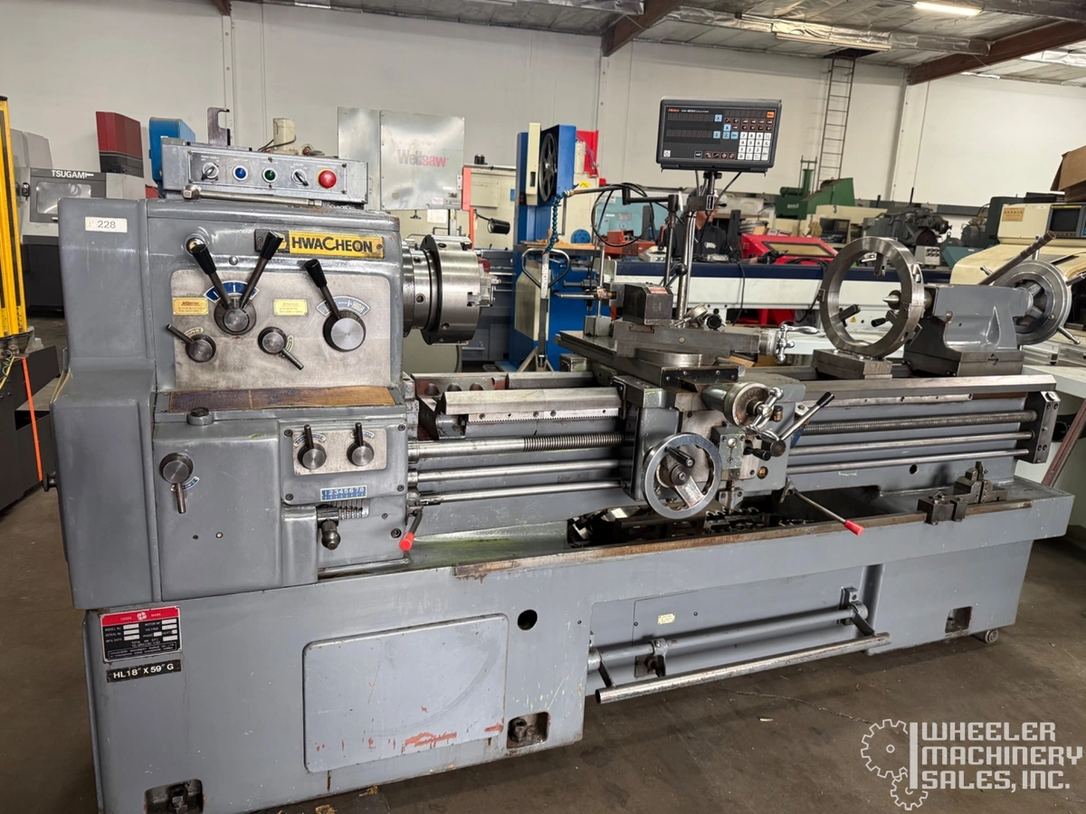 Used HWACHEON HL-18 Engine Lathe, featuring an 18" swing, 60" centers, and a 3.062" spindle bore. Powered by 7.5 hp with up to 1,800 RPM. Swing over cross slide is 12.5". Ideal for precision tasks.