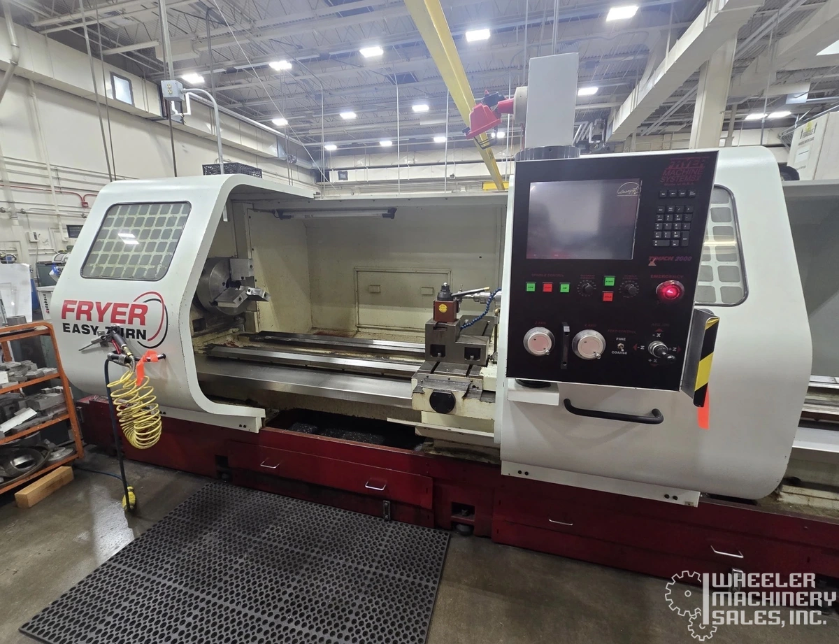 Fryer ET-30 CNC Flat Bed Lathe, featuring a 20" chuck, 4.1" bar capacity, and 30 HP spindle motor. Max RPM: 1,500. 2-axis control with Fryer Touch 2000. Offers a 15" turning diameter, 30" swing, and 80" machining length. Weighs 15,000 lbs.
