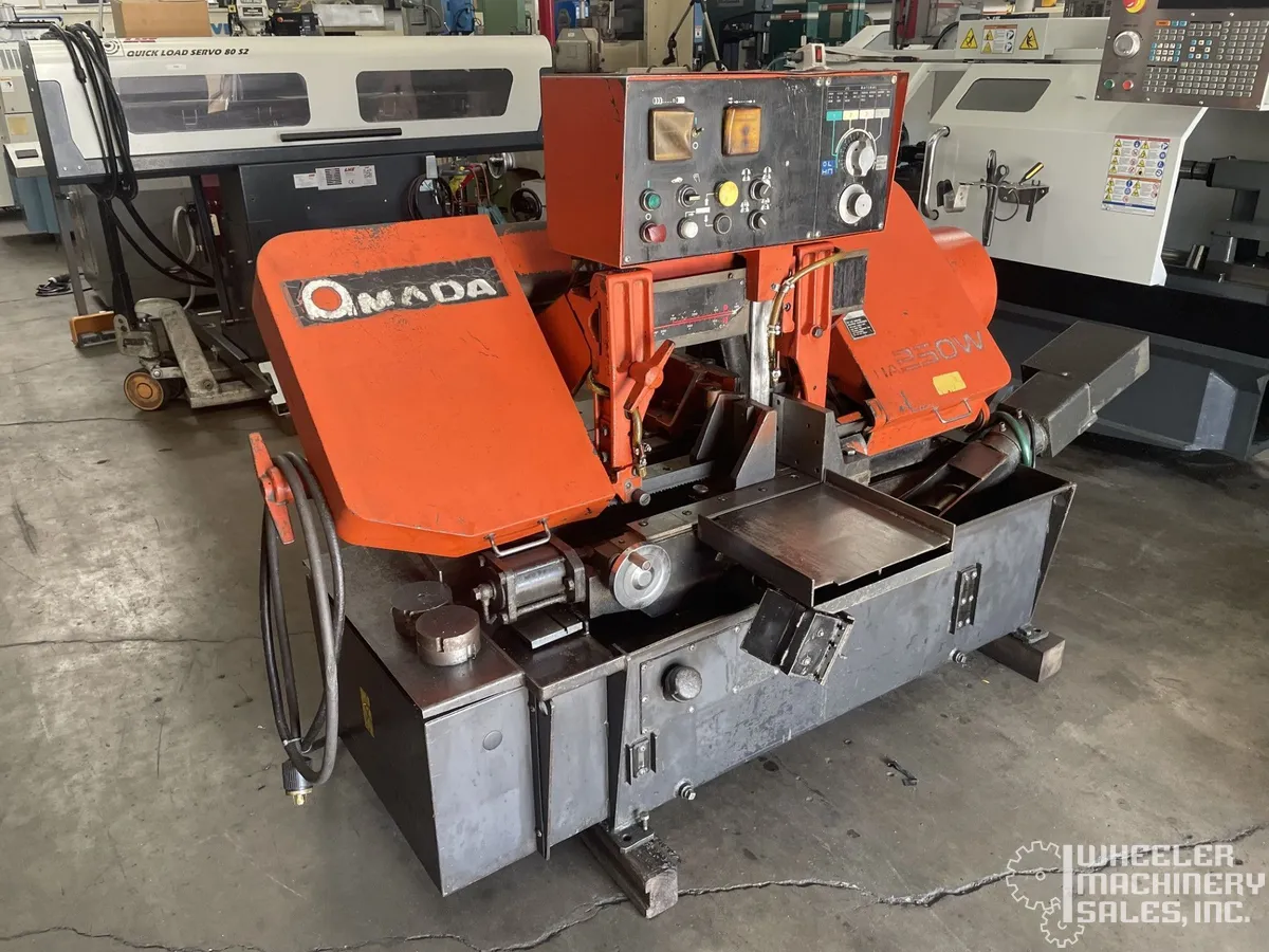 AMADA HA250W Automatic Horizontal Bandsaw for sale. Used 1997 model with a 10"x11" capacity. Features include 5 HP blade drive motor, 27-250 FPM blade speeds, and programmable cuts up to 99,999. Equipped with a hydraulic pump and coolant tank. Dimensions: 75"x77"x72".